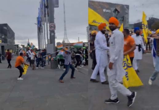 ऑस्‍ट्रेलिया में कथित जनमत संग्रह करा रहे खालिस्‍तानी आतंकियों ने भारतीयों के खिलाफ मेलबर्न में हमला कर दिया। इस घटना के वायरल हो रहे वीडियो में नजर आ रहा है कि खालिस्‍तानी समर्थक तिरंगा लेकर प्रदर्शन कर रहे भारतीयों पर हमला कर दिया। ऑस्‍ट्रेलिया में जनमत संग्रह से ठीक पहले ही खालिस्‍तानियों ने हिंदू मंदिरों को निशाना बनाना शुरू कर दिया था। मीडिया रिपोर्ट के मुताबिक खालिस्‍तानियों का दावा है कि इस जनमत संग्रह में शामिल होने के लिए 60 हजार लोग पहुंचे लेकिन असल‍ियत कुछ सौ से ज्‍यादा नहीं थी। यही नहीं इसमें बड़ी संख्‍या में पाकिस्‍तानी भी पहुंचे थे।