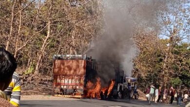 चलते ट्रक में लगी आग ड्राइवर बचा बाल बाल घटना निवास जबलपुर मार्ग