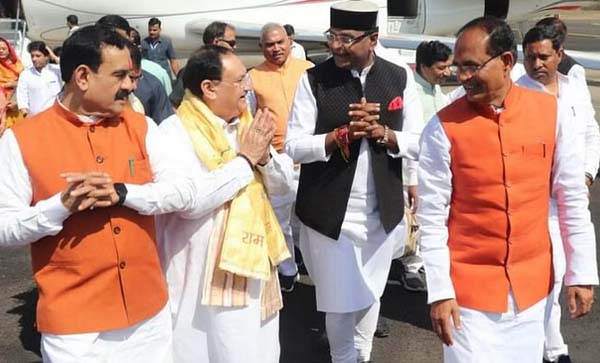 भारतीय जनता पार्टी के राष्ट्रीय अध्यक्ष जगत प्रकाश नड्डा रविवार को भोपाल दौरे पर हैं। सुबह करीब साढ़े दस बजे विमान से उनका भोपाल आगमन हुआ। स्टेट हैंगर पर सीएम शिवराज सिंह चौहान, भाजपा के प्रदेश प्रभारी पी मुरलीधर राव, प्रदेशाध्यक्ष वीडी शर्मा, केंद्रीय मंत्री ज्योतिरादित्य सिंधिया समेत पार्टी के अनेक नेताओं व कार्यकर्ताओं ने उनका आत्मीय स्वागत किया। नड्डा ने स्वागत समारोह में कहा कि जिस तरह से यहां मेरा स्वागत हुआ, उत्साह देखा, यह उत्साह आने वाले समय का संदेश दे रहा है। इस उत्साह को लक्ष्य में बदलकर इस बार 200 पार करना है।