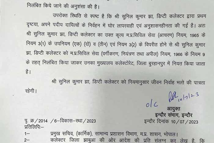 एफआईआर के बाद कलेक्टर के प्रतिवेदन पर कमिश्नर पवन शर्मा ने सुनिल कुमार झा को सस्पैंड कर दिया है। इस मामले में पुलिस की टीम भी कार्यवाही कर रही है।
