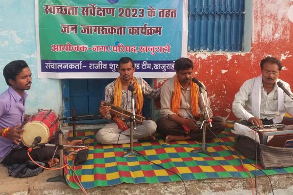 नगर परिषद खजुराहो के द्वारा इंन दिनों स्वच्छता मिशन 2023 के तहत लोगों में जागरूकता लाने के लिए गीत- संगीत के माध्यम से जन जागरूकता कार्यक्रम का संचालन किया जा रहा है जो शिखा जागरूकता कार्यक्रम के द्वारा नगर के विभिन्न वार्डों में पहुंचकर मस्तराम तिवारी एवं उनके साथियों के द्वारा शानदार गीतों के माध्यम से लोगों को स्वच्छता के प्रति जागरूक रहने के लिए प्रेरित किया जा रहा है ।